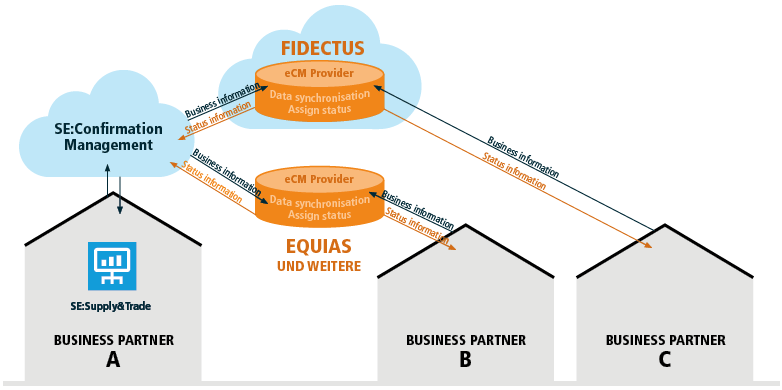 Electronic Confirmation Matching (ECM) provides you with optimal support for your back-office processes. Once the transaction has been saved in your procurement and trading system, such as SE:Supply&Trade, it is forwarded to our ECM cloud service, where it is fully automatically processed with the appropriate configurations. A status overview allows you to monitor the dispatch of the message and the confirmation from the trading partner. We support both Equias and Fidectus matching according to the EFET market standard.