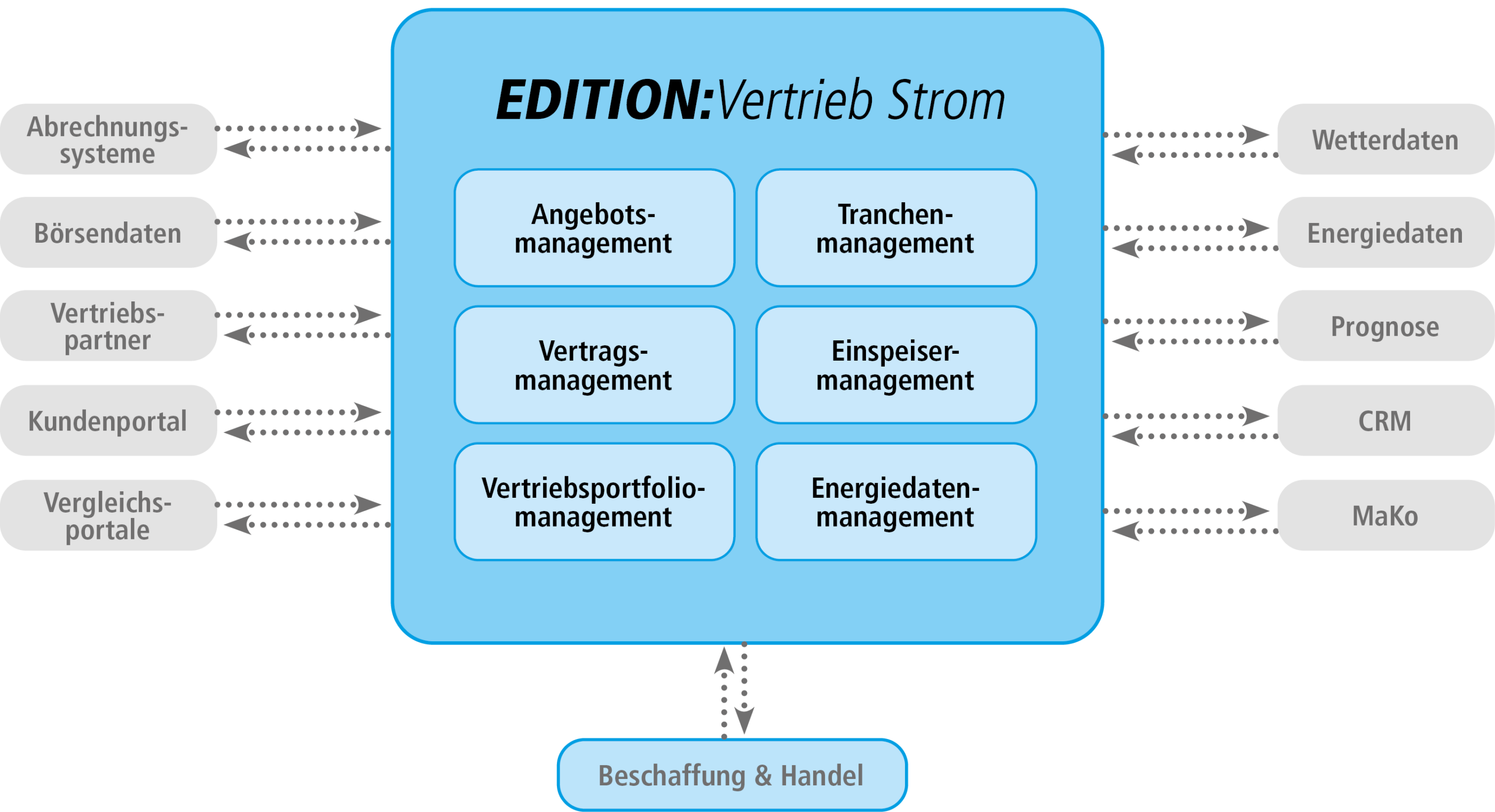 Die EDITION:Vertrieb Strom hat ihren Schwerpunkt im Lastgang-, Angebots-, Vertrags- und Tranchenmanagement. Zentraler Bestandteil ist außerdem das Energiedatenmanagement der Entnahme- und Einspeisestellen für die Commodity Strom.
