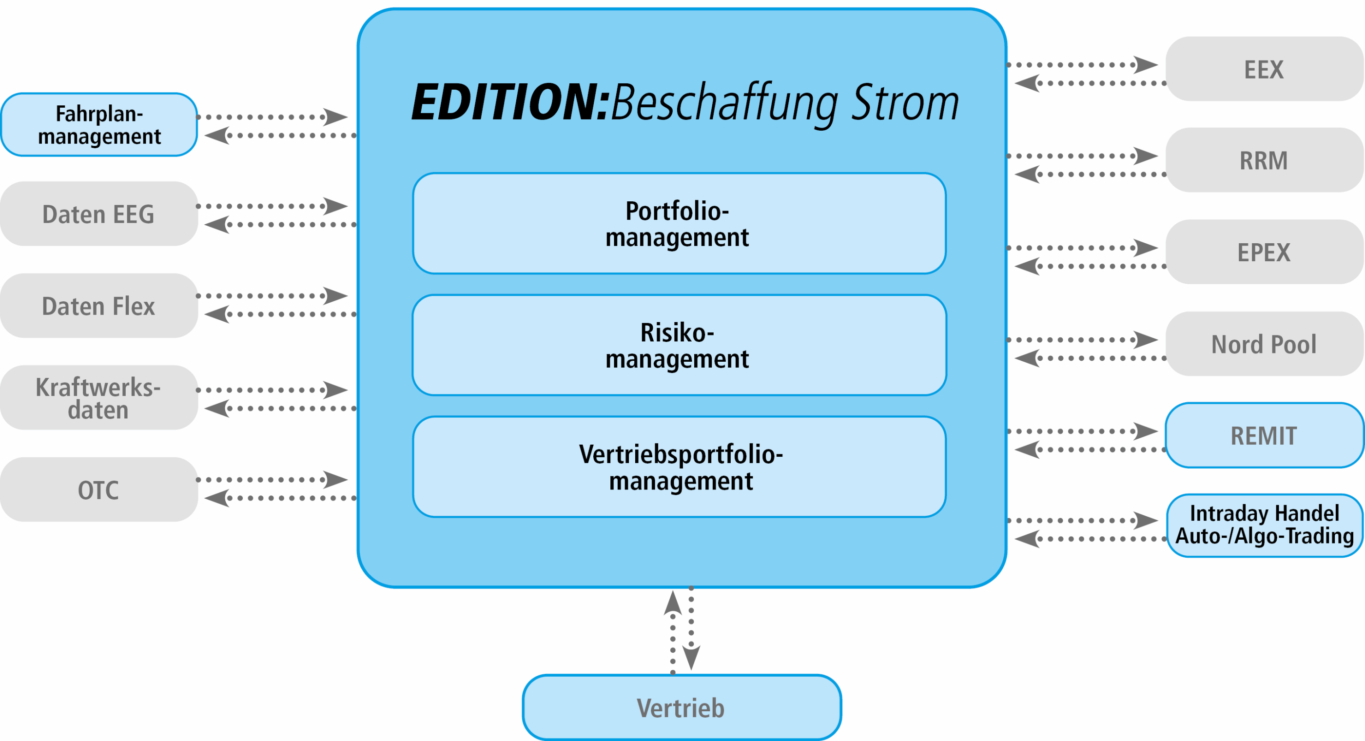Vertriebsportfoliomanagement – als Bindeglied zwischen Vertrieb und Beschaffung – bündelt die Mengen des Vertriebs und übergibt diese an die Beschaffung. Bei Übergabe werden die Mengen (Lastgänge) mit einem definierten Transferpreis bewertet. Somit ist die interne Verrechnung zwischen den Organisationseinheiten Vertrieb und Beschaffung automatisiert und transparent in einem System hinterlegt. Der Aufbau des Vertriebsportfolios in beliebig viele Teilportfolios, wie z. B. Vertriebsmengen für Sondervertragskunden, Gewerbekunden und Privatkunden, ist konfigurierbar und lässt sich an die individuellen Bedürfnisse der jeweiligen Organisation anpassen. Neben der Verwaltung der Prognosemengen werden die Bestellungen des Vertriebs in einer Art Buchführung verwaltet. Je nach Konfiguration können vertragsscharfe Bestellungen, z. B. bei Vertragsabschluss, Prognoseanpassung oder Tranchenbestellung, ausgelöst werden. Zusätzlich können zeitgesteuert Sammelbestellungen für offene Mengen im Vertriebsportfolio erzeugt werden. Eine direkte technische Kopplung der EDITION:Beschaffung Strom mit der EDITION:Vertrieb Strom ist möglich, womit ein transparenter, schneller und sicherer Austausch von Mengen und Preisen sichergestellt wird.