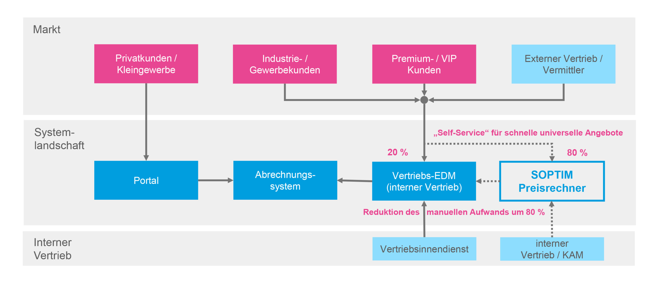 Für den neuen Vertriebschef bei Soptim, Andreas Eiden, kommt der Online-Preisrechner genau zur richtigen Zeit. Das Tool hilft seinen Kunden im Vertrieb an jenen Stellen, wo aktuell der Schuh am meisten drückt. »Stadtwerke und Energieversorger werden in die Lage versetzt, die eigene Webseite als Vertriebskanal für Gewerbe- und Individualkunden zu nutzen – und das auf maximal einfache Art und Weise«, erklärt Eiden. Wo und wie der Online-Preisrechner auch eingesetzt wird: Der Vertrieb gewinnt im Gewerbe- und Großkundenbereich enorm an Geschwindigkeit. Wer ihn nutzt, bleibt sogar in Zeiten sprunghafter Energiemarktpreise handlungsfähig. Dabei lässt sich der Online-Preisrechner ähnlich einfach bedienen wie Portale für Standardlastprofilkunden. Man kann ihn auch problemlos für gemischte RLM- und SLP-Angebote nutzen. Das heißt, auch Filialisten und Bündelkunden lassen sich damit problemlos ansprechen.