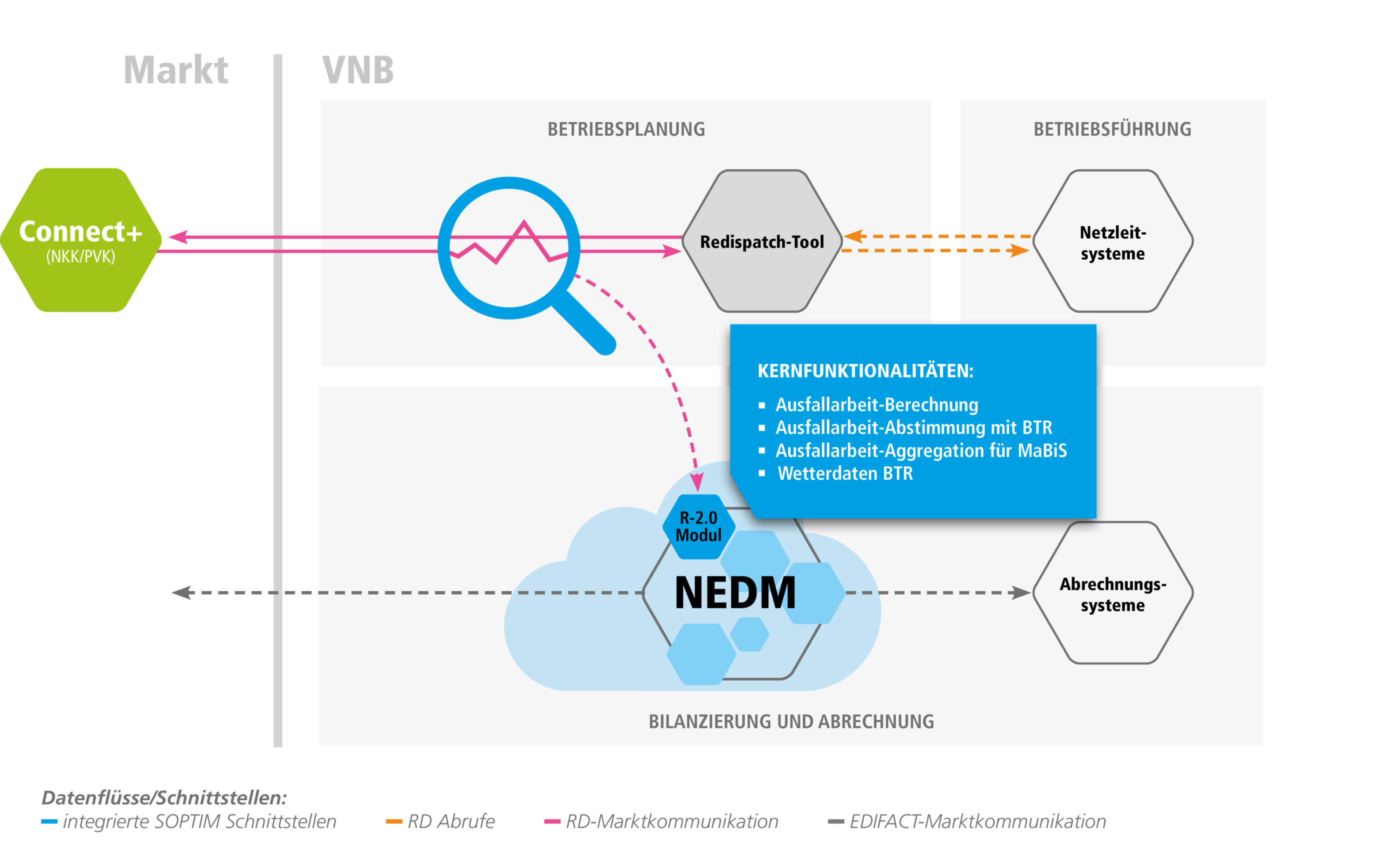 Die angepassten Ausfallarbeitszeitreihen werden durch den integrierten Rechenkern in den für MaBiS-Kommunikation benötigten Aggregaten bereitgestellt und stehen manuell oder automatisiert in marktüblichen Formaten zur Verfügung. Die Bereitstellung der Redispatch-Maßnahmen inklusive der berechneten Ausfallarbeit im CSV/Excel-Format gewährleistet zusätzlich eine flexible und schnelle Weiterverarbeitung. Das Ergebnis ist eine zuverlässige Datenbasis aus automatisiert bzw. manuell aus der Anwendung erstellten Berichten und Exporten, die im bilanzierenden System zur MaBiS-Kommunikation sowie zur Vergütungsermittlung an ein Abrechnungssystem verwendet werden können. Hiervon profitiert ein großer Anwenderkreis, denn neben der nahtlosen Integration von NEDM in bestehende SOPTIM-Energiewirtschaftsprodukte lässt es sich durch standardisierte Schnittstellen auch mit Softwareprodukten anderer Hersteller flexibel einsetzen.